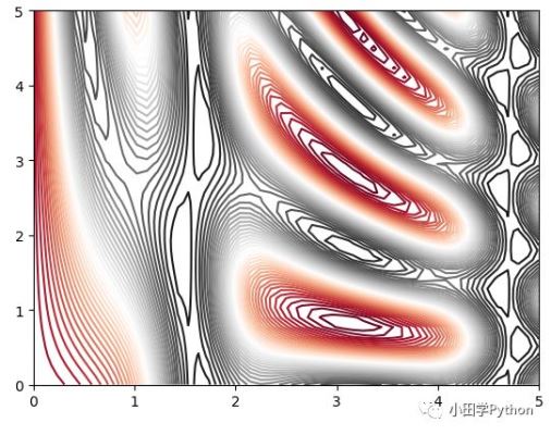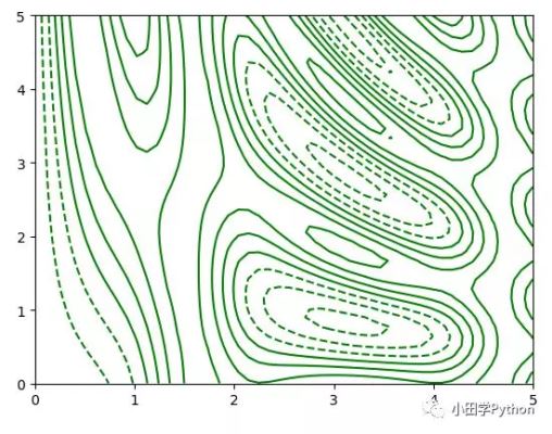 import matplotlib.pyplot as plt import numpy as np def f(x, y): return np.sin(x) ** 10 + np.cos(10 + y * x) * np.cos(x) x = np.linspace(0, 5, 50) y = np.linspace(0, 5, 40) # 得到网格点矩阵 x, y =np.meshgrid(x, y) # 计算z轴的值 z = f(x, y) # 绘制图形 plt.contour(x, y, z, colors='green') # plt.contour(x, y, z, 50, cmap='RdGy') # 更改配色,值50等分,红灰配色 plt.show()