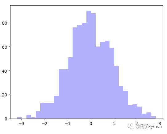import matplotlib.pyplot as plt import numpy as np data = np.random.randn(1000) plt.hist(data, bins=30, alpha=0.3, histtype='stepfilled', color='blue', edgecolor='none') plt.show()