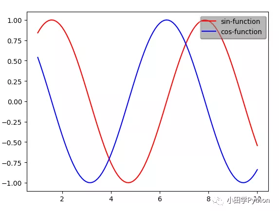 # 示例 import matplotlib.pyplot as plt import numpy as np x = np.linspace(1, 10, 100) fig, ax = plt.subplots() ax.plot(x, np.sin(x), color='red', label='sin-function') ax.plot(x, np.cos(x), color='blue', label='cos-function') ax.legend(loc='upper right', frameon=True, shadow=True, framealpha=0.2) # 设置图例位置为右上,有边框,有阴影,且透明度为0.2 plt.show()