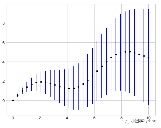 plt.errorbar(x, y, yerr=dy, fmt='.k', ecolor='blue')