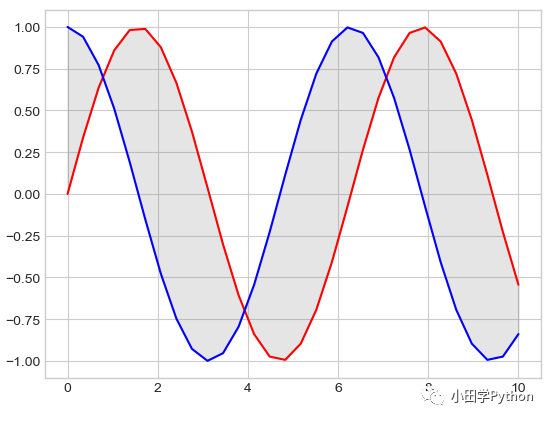 plt.fill_between(x, ysin, ycos, color='gray', alpha=0.2)