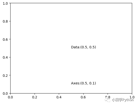 import matplotlib.pyplot as plt import numpy as np fig, ax = plt.subplots() ax.axis = ([0, 1, 0, 1]) ax.text(0.5, 0.5, "Data:(0.5, 0.5)", transform=ax.transData) ax.text(0.5, 0.1, "Axes:(0.5, 0.1)", transform=ax.transAxes) plt.show()