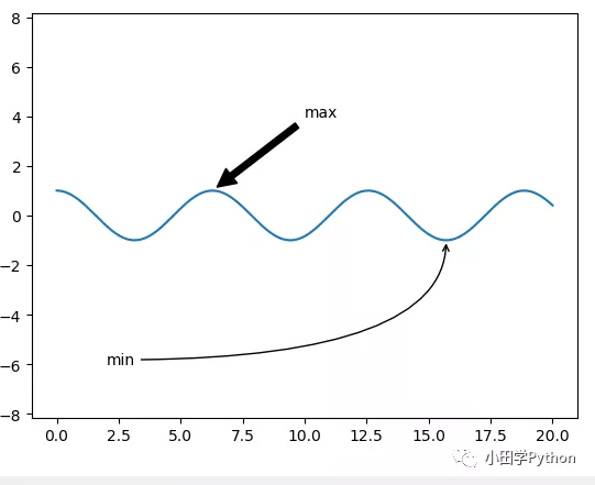 ax.annotate('min', xy=(5 * np.pi, -1), xytext=(2, -6), arrowprops=dict(arrowstyle="->", connectionstyle='angle3, angleA=0, angleB=-90'))