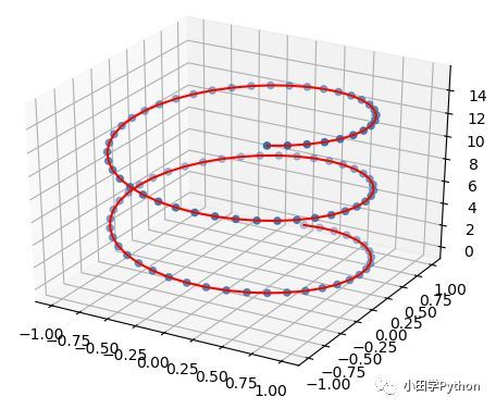 import numpy as np import matplotlib.pyplot as plt from mpl_toolkits import mplot3d fig = plt.figure() ax = plt.axes(projection='3d') z = np.linspace(0, 15, 100) x = np.sin(z) y = np.cos(z) ax.plot3D(x, y, z, 'red') ax.scatter3D(x, y, z, 'blue') plt.show()