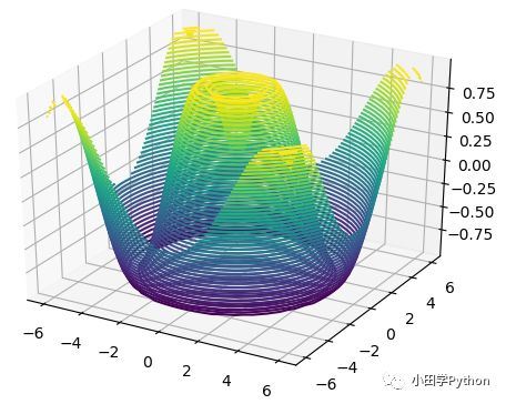 import numpy as np import matplotlib.pyplot as plt from mpl_toolkits import mplot3d fig = plt.figure() ax = plt.axes(projection='3d') def f(x, y): return np.sin(np.sqrt(x ** 2 + y ** 2)) x = np.linspace(-6, 6, 30) y = np.linspace(-6, 6, 30) X, Y =np.meshgrid(x, y) Z = f(X, Y) ax.contour3D(X, Y, Z, 50) plt.show()