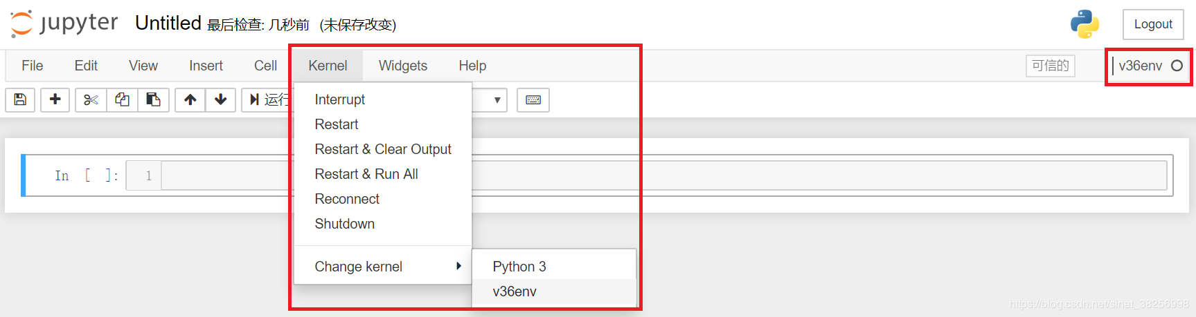 打开后Jupyter Notebook后,就可以在Kernel-Change kernel中看到刚刚添加的虚拟环境了,我的是v36env。当你选择该虚拟环境后,右上角应该显示为可信的(而不是挂掉了)。