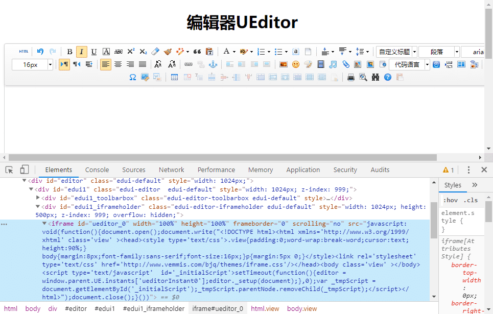 整个富文本编辑器是通过iframe嵌入到网页中的,手动尝试输入内容,发现内容是输入到iframe页面的body中的,