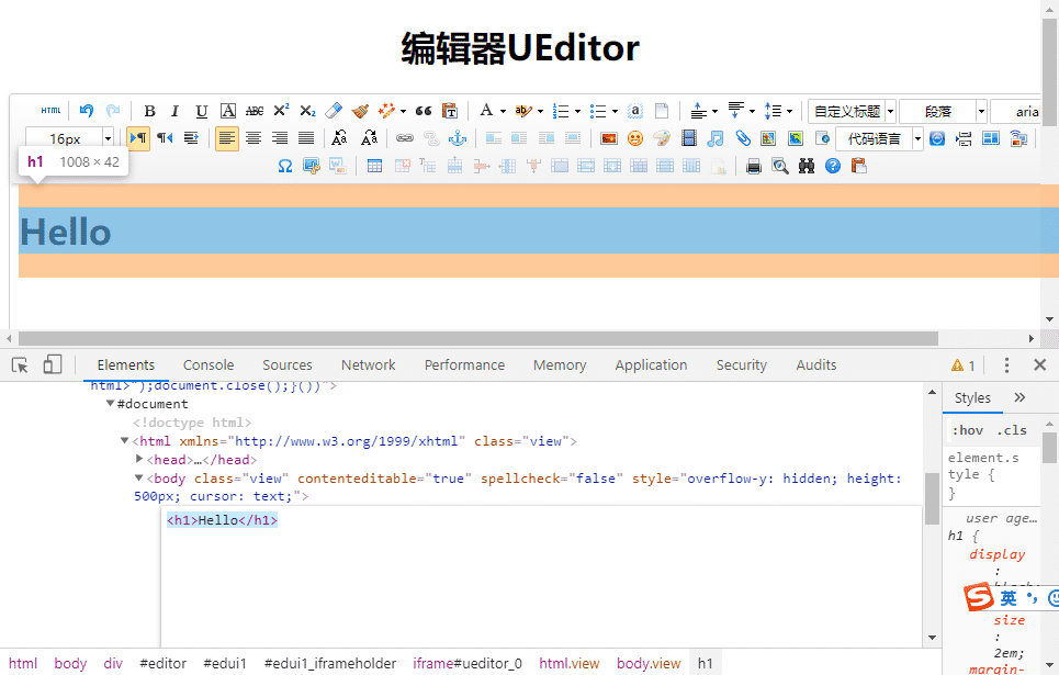js = "document.querySelector('#ueditor_0').contentDocument.querySelector('body').innerHTML='<h1>Hello</h1>'"