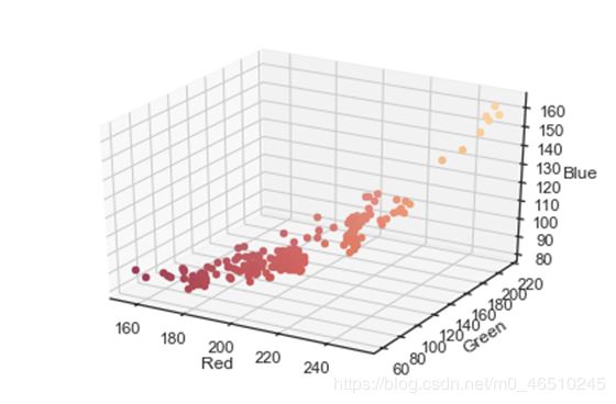 kmeans_df = pd.DataFrame(kmeans.cluster_centers_, columns = ['Red', 'Green', 'Blue'])