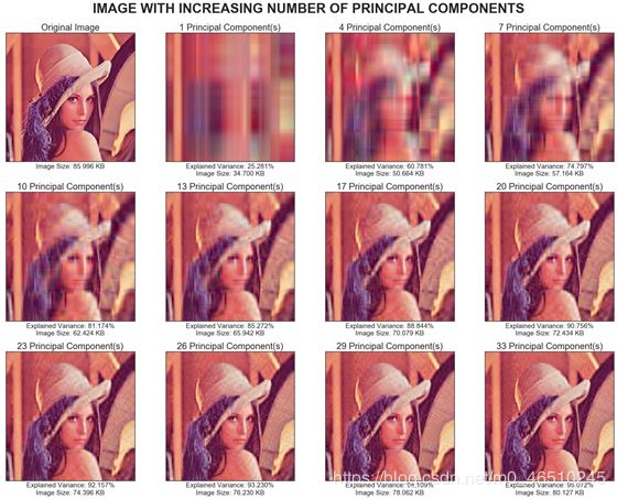 从图中可以得出结论,应当33个主成分,因为它给我们提供了较小的图像大小和相当高的解释方差,并且比使用19个主要成分更接近原始图像。
