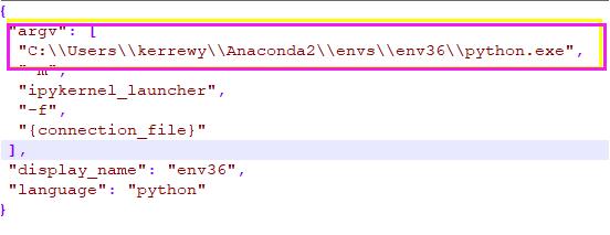 其中,C:\ProgramData\jupyter\kernels\env36\kernel.json文件中Python解释器的位置为: