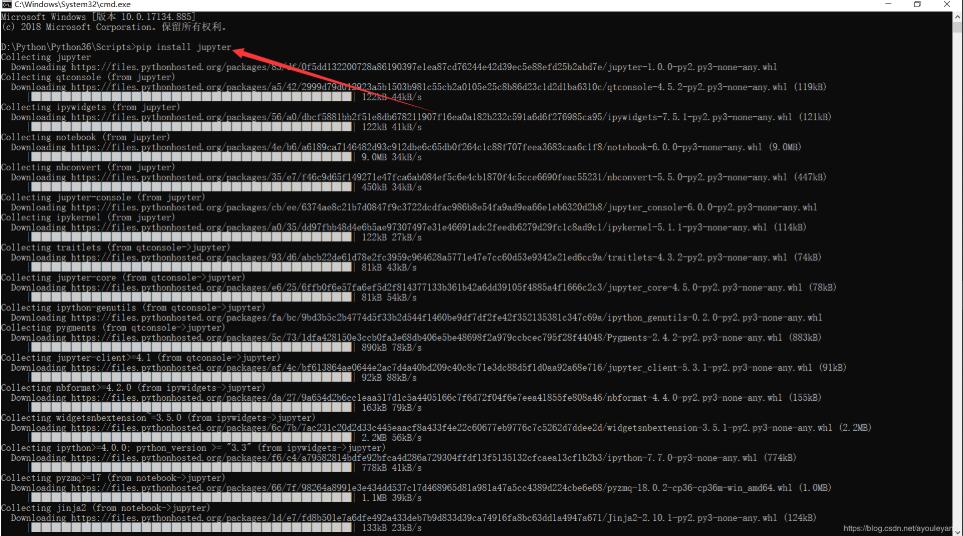 (2)在控制台输入pip install jupyter >回车,文件有点大,等等就好