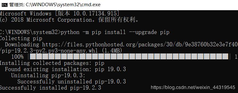 5、解决可能出现的另一个问题:You are using pip version 19.0.3, however version 19.2.3 is available.