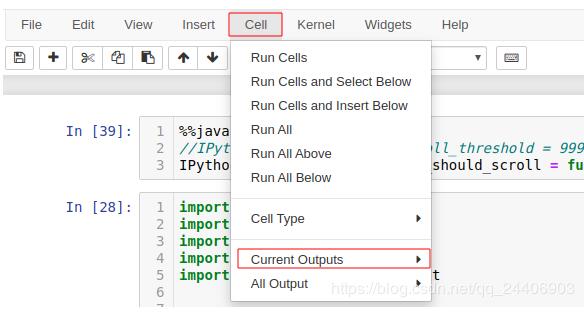 1.鼠标点击方式: 先选中代码单元; 然后点击菜单栏的Cell;然后选择下图第二个矩形框中的Currennt Outputs;最后点击toggle即可