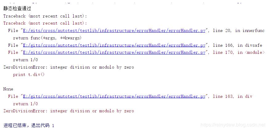1 EXCEPTION captured at function two EXCEPTION captured at function three Traceback (most recent call last): EXCEPTION captured at function four File "E:/pydev/异常处理装饰器.py", line 37, in inner EXCEPTION captured at function one return func(*args, **kwargs) EXCEPTION captured at function five File "E:/pydev/异常处理装饰器.py", line 138, in two w = 1 / 0 ZeroDivisionError: integer division or modulo by zero Traceback (most recent call last): File "E:/pydev/异常处理装饰器.py", line 37, in inner return func(*args, **kwargs) File "E:/pydev/异常处理装饰器.py", line 129, in three w = 1 / 0 ZeroDivisionError: integer division or modulo by zero Traceback (most recent call last): File "E:/pydev/异常处理装饰器.py", line 37, in inner return func(*args, **kwargs) File "E:/pydev/异常处理装饰器.py", line 134, in four w = 1 / 0 EXCEPTION captured at function pro ZeroDivisionError: integer division or modulo by zero EXCEPTION captured at function five Traceback (most recent call last): EXCEPTION captured at function five File "E:/pydev/异常处理装饰器.py", line 37, in inner EXCEPTION captured at function seven return func(*args, **kwargs) File "E:/pydev/异常处理装饰器.py", line 115, in one w = 1 / 0 ZeroDivisionError: integer division or modulo by zero Traceback (most recent call last): File "E:/pydev/异常处理装饰器.py", line 37, in inner return func(*args, **kwargs) File "E:/pydev/异常处理装饰器.py", line 104, in five w = 1 / 0 ZeroDivisionError: integer division or modulo by zero Traceback (most recent call last): File "E:/pydev/异常处理装饰器.py", line 37, in inner return func(*args, **kwargs) File "E:/pydev/异常处理装饰器.py", line 148, in pro self.var = value / 0 ZeroDivisionError: integer division or modulo by zero 1 1 Traceback (most recent call last): File "E:/pydev/异常处理装饰器.py", line 37, in inner return func(*args, **kwargs) File "E:/pydev/异常处理装饰器.py", line 104, in five w = 1 / 0 ZeroDivisionError: integer division or modulo by zero Traceback (most recent call last): File "E:/pydev/异常处理装饰器.py", line 37, in inner return func(*args, **kwargs) File "E:/pydev/异常处理装饰器.py", line 37, in inner return func(*args, **kwargs) File "E:/pydev/异常处理装饰器.py", line 104, in five w = 1 / 0 ZeroDivisionError: integer division or modulo by zero Traceback (most recent call last): File "E:/pydev/异常处理装饰器.py", line 37, in inner return func(*args, **kwargs) File "E:/pydev/异常处理装饰器.py", line 157, in seven return 1/0 ZeroDivisionError: integer division or modulo by zero c.eight被跳过,所以没有被里层捕获,才会不打堆栈直接走到这里 最后这个会真正触发异常,因为mobj实例并没有被装饰过 Traceback (most recent call last): File "E:/pydev/�쳣����װ����.py", line 212, in <module> m.five() File "E:/pydev/�쳣����װ����.py", line 104, in five w = 1 / 0 ZeroDivisionError: integer division or modulo by zero 进程已结束,退出代码 1