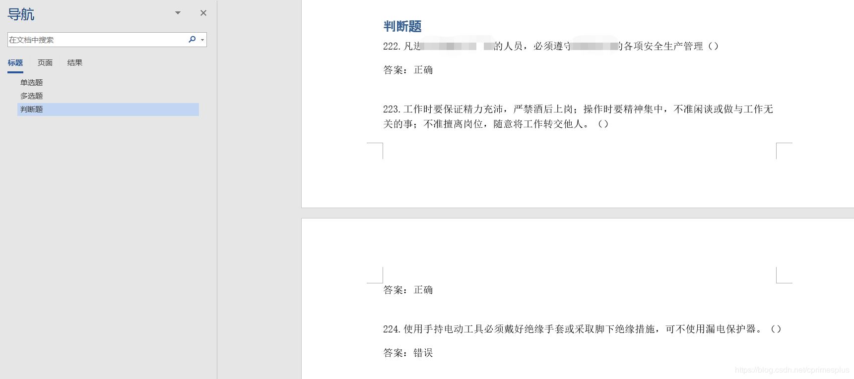 题型分为单选题,多选题,判断题。表格中对于每一个题都有其对应的类型描述,无外这三种。同时,同一类的数据是聚集在一起的,因此,可以设置标志位记录前一个题目所属的题型,如果当前类别和上一个相同,则只需要写入题号题干等;如果不同,就使用docx中的Document.add_heading()方法新建立一个标题。