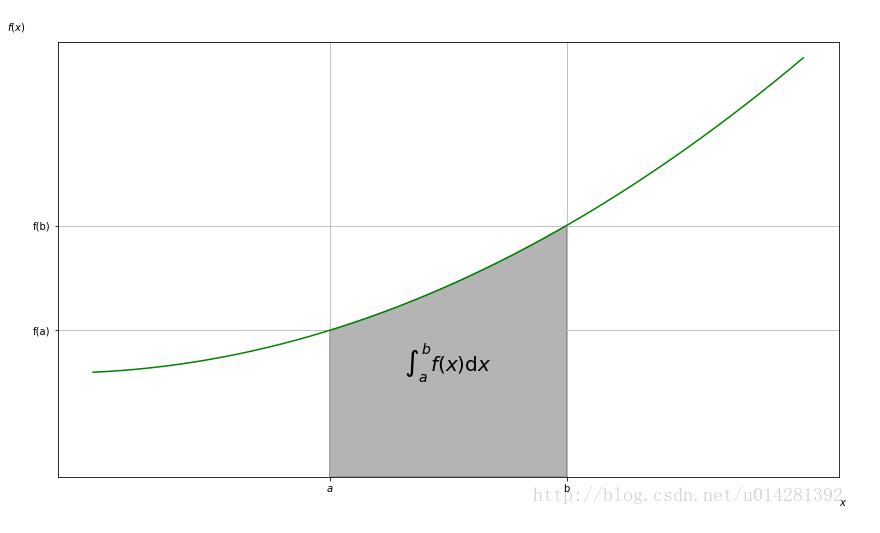 plt.text(0.5 * (a+b), 1, r"$\int_a^b f(x)\mathrm{d}x$",