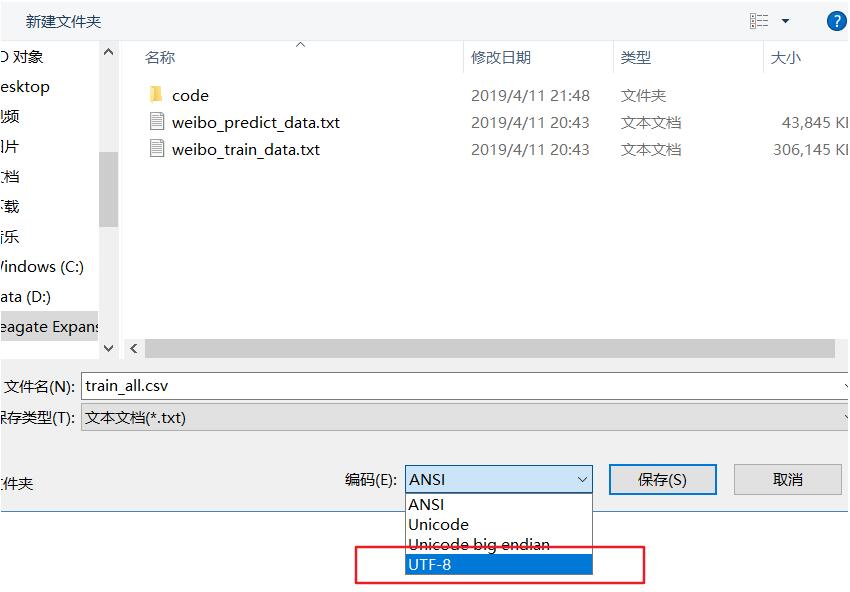 2.打开文件选择“文件”----->"另存为“,我们可以看到默认编码是:ANSI,选择UTF-8重新保存一份,再使用pd.read_csv()打开就不会保存了
