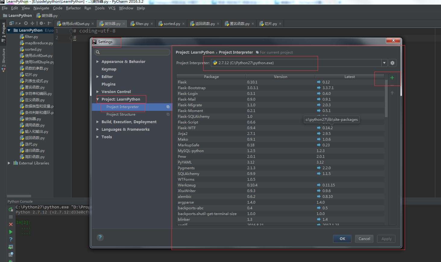 1.打开Pycharm,依次点击File----->Settings----->Project Interpreter,如图所示,会显示所有Python 环境下已安装的package的详情,包括名称,当前版本号,最新版本号;