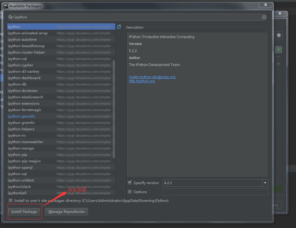 2.点击右侧"+"号,新增package,进入package安装界面,搜索"ipython",选择4.2.1指定版本进行安装