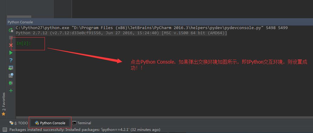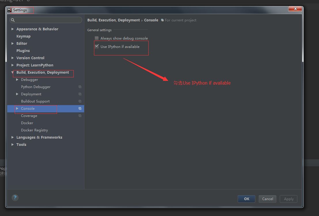 (2) 在pycharm里设置默认控制台为IPython交互环境 pycharm默认的控制台交互环境是原生Python交互环境,需要把交互环境改成已经安装完成的IPython交互环境,具体设置如图所示: