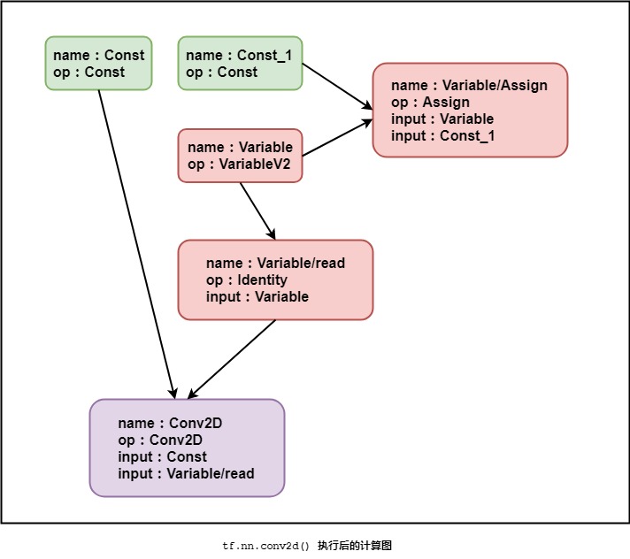 需要注意的是,如果没有对结点进行命名,Tensorflow自动会将其命名为:Const、Const_1、const_2......。其他类型的结点类同。