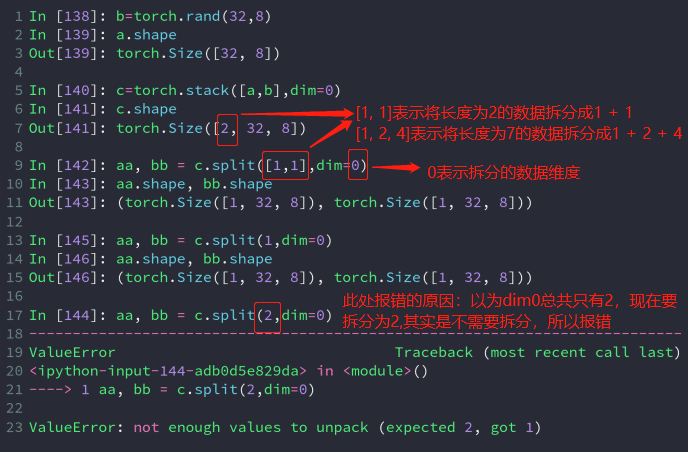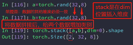 与cat不同的是,stack创建了一个新的维度,在拼接的同时,给数据增加了类别。并且stack的所有数据维度必须一致。