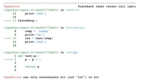 这段代码很简单,当我们执行fastdebug()时,会执行fastdebug函数并在该函数中调用另一个函数test(),test函数接收一个参数p并计算p+1的值传出。很明显,在高亮的一句代码中传进去的参数temp是str,所以当我们执行上面一段代码时一定会报错
