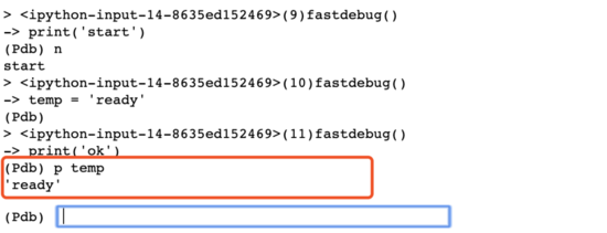 在Pdb中我们可以使用p + 变量名来查看变量值,比如我们查看变量temp的值