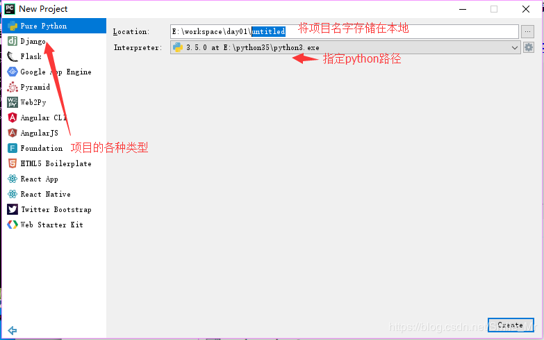 安装好pycharm后点开就会出现以上界面à点击Create New project (创建新的project),