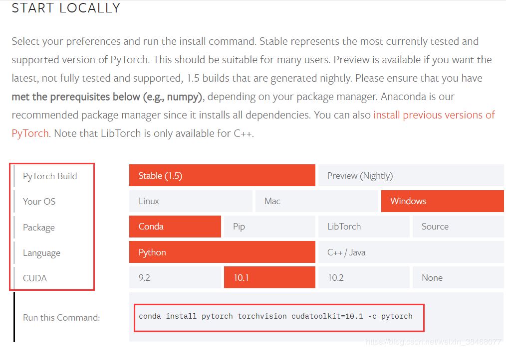 这里最主要的是那个CUDA的版本,此处我选择的是10.1,是因为我的电脑的 cuda版本信息就是这样的。具体的查看方法可在4.5节查阅。