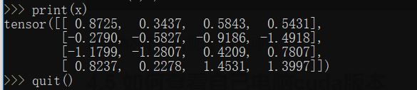 >>> import torch >>> x=torch.randn(4,4) >>> print(x)