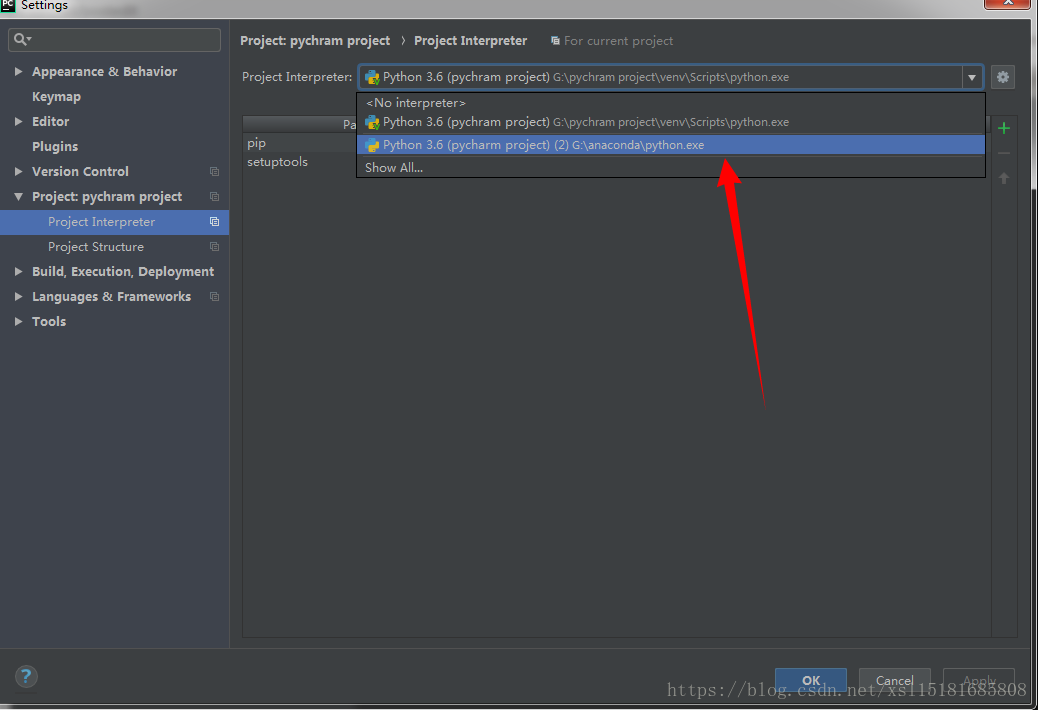 把project Interpreter复选框里面的地址换成你安装的anaconda下的python.exe的地址