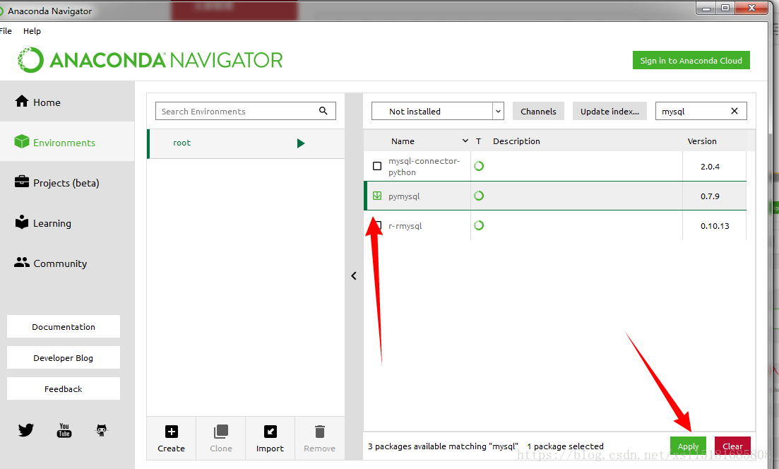 由于我已经安装了scrapy库,我以我没安装的pymysql库为例,搜索出来后先√上目标库前面的复选框,再点击apply