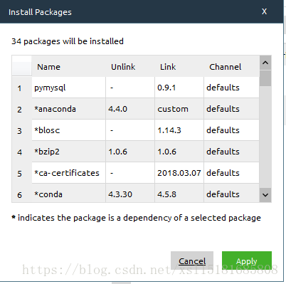 然后他就会弹出窗口让你安装你要的库了,因为环境需要,他会先安装scrapy库所需要的其他库作为前提,直接点击apply就可以了,他就会自动安装你所需要的库了