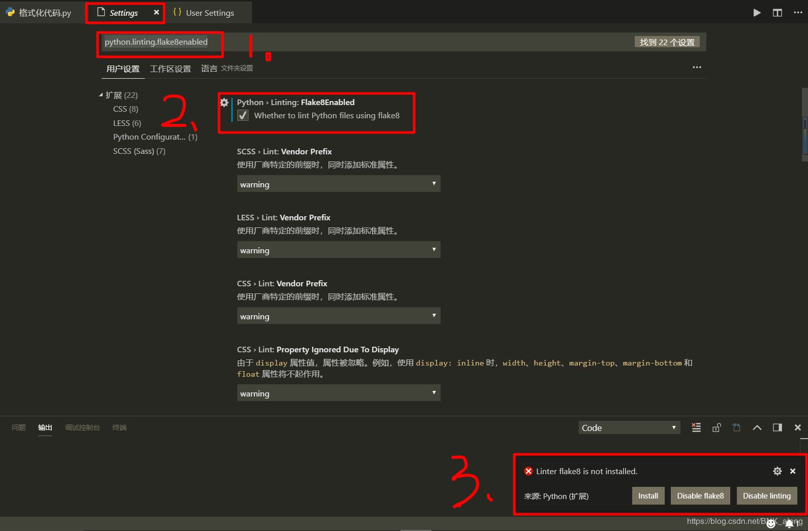 1.在VScode中打开设置,搜索python.linting.flake8enabled