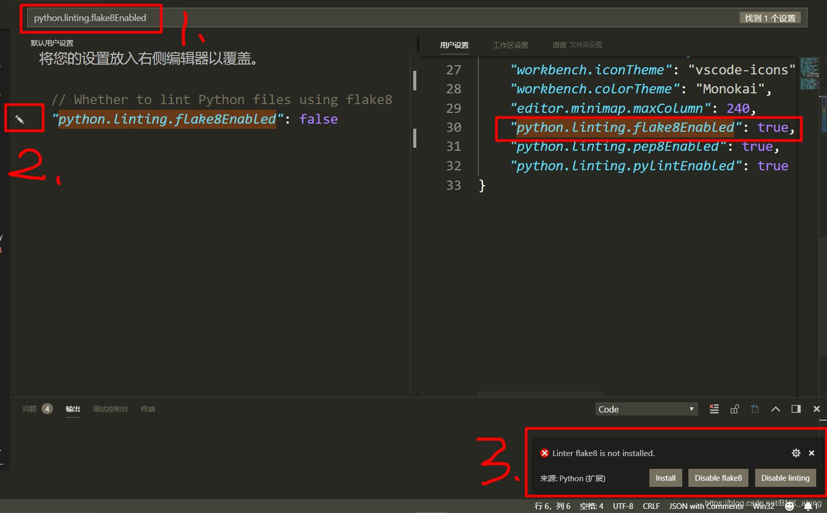点击左侧默认用户设置"python.linting.flake8Enabled: false的笔形图形,选择true;或者直接在右侧栏自定义设置中,添加"python.linting.flake8Enabled": true