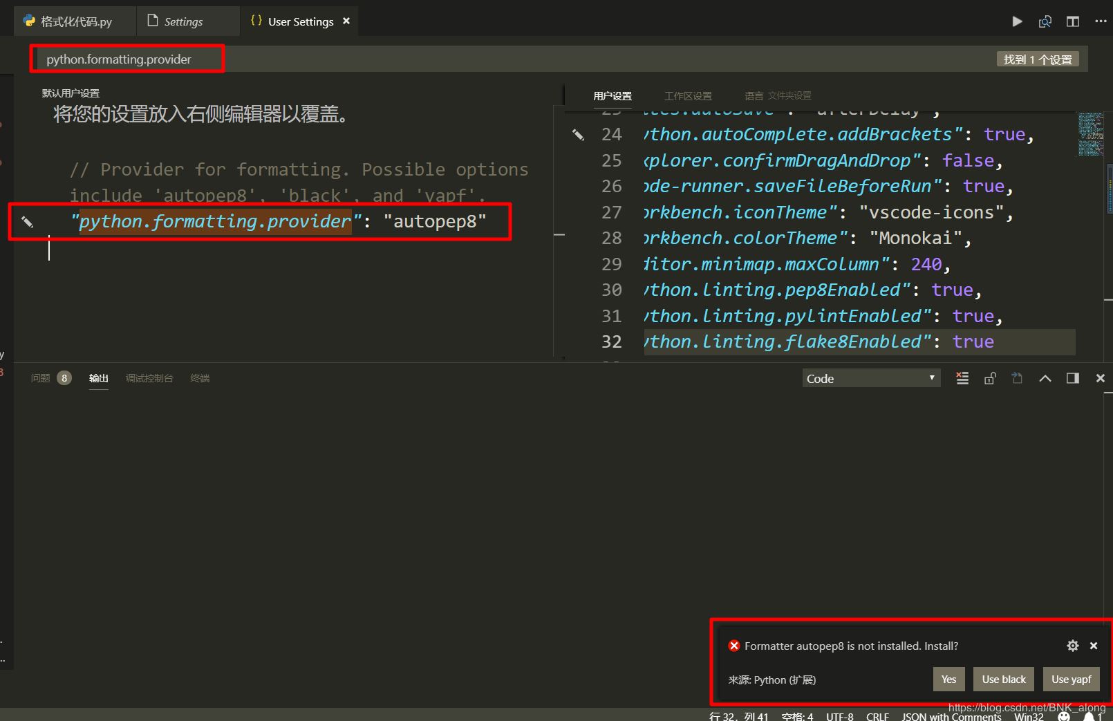 或者在Settings.json中点击左侧的笔形图形,修改“python.formatting.provider”的值,若未安装工具,则右下角会弹出配置通知,选择喜欢的工具安装即可。