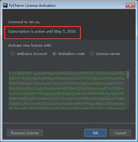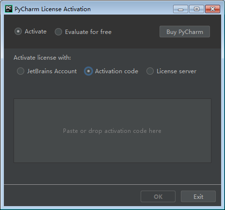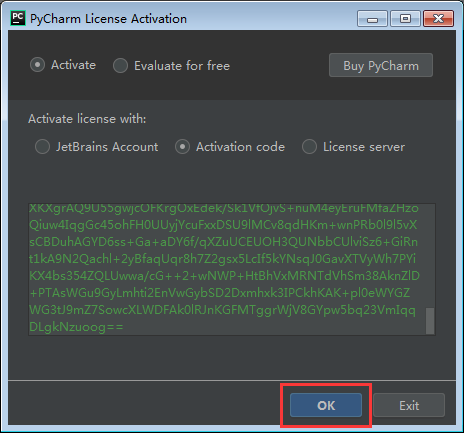 第一步:点击‘Activation code',授权激活pycharm,如下图所示:
