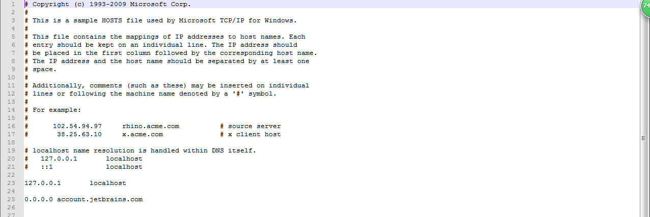 在文件的末尾添加“0.0.0.0 account.jetbrains.com”,如下图所示: