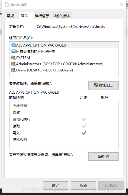 右键,属性,安全,点击编辑,修改的权限(不同电脑计算机名字是不一样的,根据自己的计算机名来改)如下图,分别给修改和写入后边打上对勾