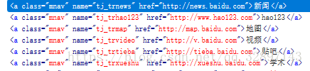 这些复数定位方式每次取到的都是具有相同类型属性的一组元素,所以返回的是一个list队列,我们也可以利用这个去定位单个的元素。比如百度首页种,右上角有新闻、视频、地图、贴吧等一些链接,我们通过f12查看源码可以发现,这些链接都有共同的class, 。