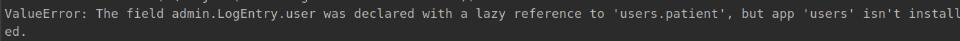 ValueError: The field admin.LogEntry.user was declared with a lazy reference to 'user.patient', but app 'users' isn't installed.
