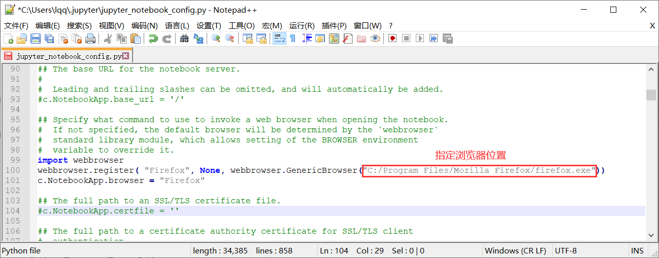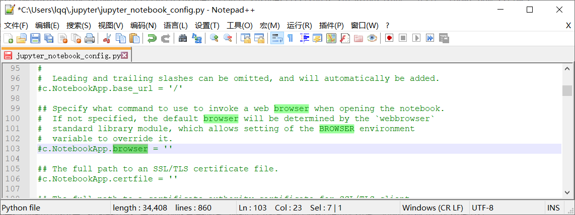 打开jupyter_notebook_config.py文件,搜索c.NotebookApp.browser