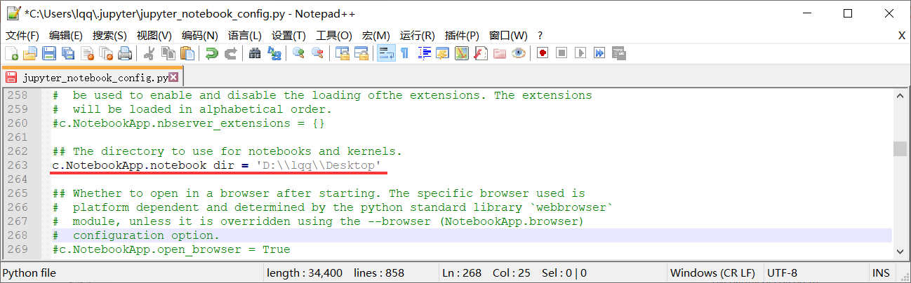也可以通过搜索c.NotebookApp.notebook_dir,修改#c.NotebookApp.notebook_dir = ''代码,更改Jupyter notebook默认打开路径