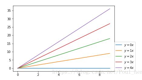 import matplotlib.pyplot as plt import numpy as np x = np.arange(10) fig = plt.figure() ax = plt.subplot(111) for i in xrange(5): ax.plot(x, i * x, label='$y = %ix$' % i) plt.legend() plt.show()