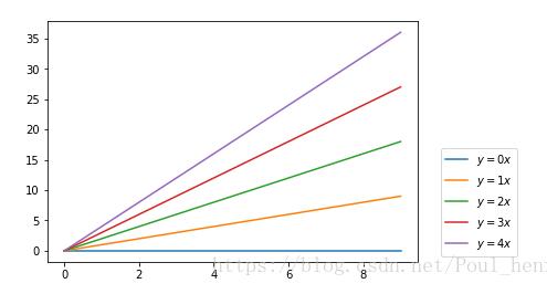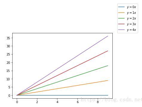 import matplotlib.pyplot as plt import numpy as np x = np.arange(10) fig = plt.figure() ax = plt.subplot(111) for i in xrange(5): ax.plot(x, i * x, label='$y = %ix$' % i) plt.legend(bbox_to_anchor=(1.05, 1), loc=2, borderaxespad=0) plt.show()