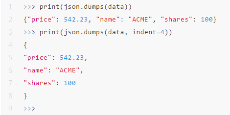 在编码 JSON 的时候,还有一些选项很有用。如果你想获得漂亮的格式化字符串 后输出,可以使用json.dumps() 的 indent 参数。它会使得输出和 pprint() 函数效果 类似。比如: