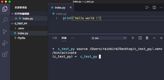 ➜ Desktop mkdir c_test_py ➜ Desktop cd c_test_py ➜ c_test_py mkdir .venv ➜ c_test_py pipenv --python 3.8.2 Creating a virtualenv for this project... Pipfile: /Users/rainbird/Desktop/c_test_py/Pipfile Using /Users/rainbird/.pyenv/versions/3.8.2/bin/python (3.8.2) to create virtualenv... ⠸ Creating virtual environment...Already using interpreter /Users/rainbird/.pyenv/versions/3.8.2/bin/python Using base prefix '/Users/rainbird/.pyenv/versions/3.8.2' New python executable in /Users/rainbird/Desktop/c_test_py/.venv/bin/python Installing setuptools, pip, wheel... done. Running virtualenv with interpreter /Users/rainbird/.pyenv/versions/3.8.2/bin/python ✔ Successfully created virtual environment! Virtualenv location: /Users/rainbird/Desktop/c_test_py/.venv Creating a Pipfile for this project... ➜ c_test_py pipenv shell Launching subshell in virtual environment... . /Users/rainbird/Desktop/c_test_py/.venv/bin/activate ➜ c_test_py . /Users/rainbird/Desktop/c_test_py/.venv/bin/activate (c_test_py) ➜ c_test_py python -V Python 3.8.2 (c_test_py) ➜ c_test_py
