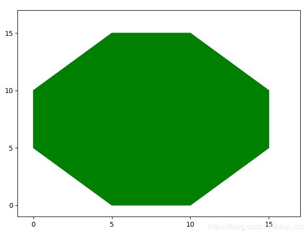 以规则八边型为例: import matplotlib.pyplot as plt import numpy as np # 设置八边形顶点坐标 x = [0, 0, 5, 10, 15, 15, 10, 5] y = [5, 10, 15, 15, 10, 5, 0, 0] # 通过调用 fill() 函数 完成绘制八边形 # 参数 x 和 y 是用来绘制封闭区域顶点的有序坐标集 # 参数 color 用来指定封闭区域的填充颜色 plt.fill(x, y, color="green") # 为了可视化效果更好,使用函数 xlim() 和 ylim() 完成多边型在整个坐标轴中的相对位置调整(可自行删除对比效果) plt.xlim(-1, 17) plt.ylim(-1, 17) # 使用 xticks() 和 yticks() 调整刻度线的显示位置 # np.arange(起始坐标,结束坐标,坐标间隔) plt.xticks(np.arange(0, 16, 5)) plt.yticks(np.arange(0, 16, 5)) # 调用 show() 函数展示图形的绘制效果 plt.show()